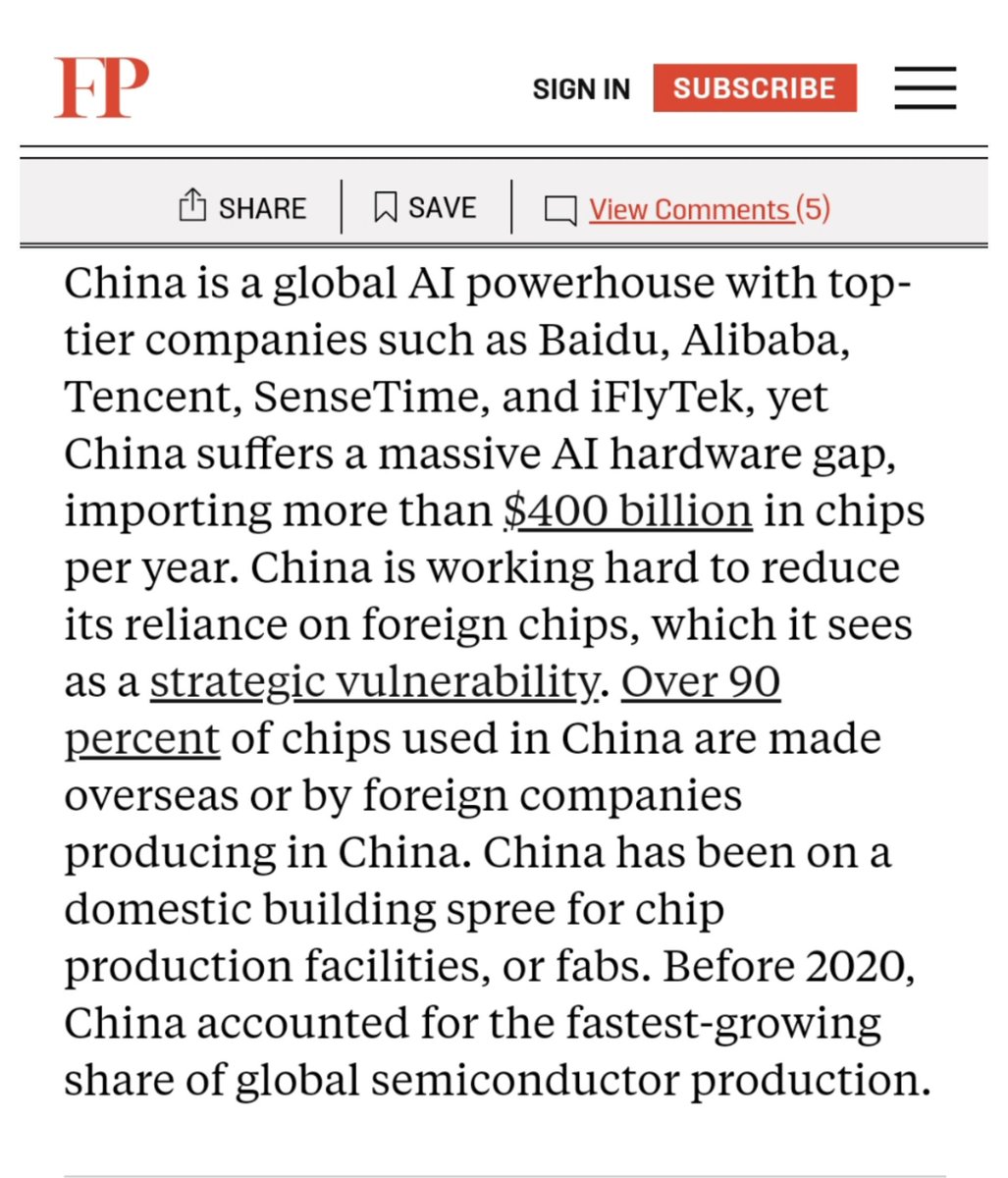 تعدّ الصين مستورداً صافياً لأشباه الموصلات، وتعتمد بشكل كبير على الشركات المصنعة الأجنبية ــ لا سيما الامريكية ـــ لتمكين معظم تقنياتها خاصة مايتعلق بالذكاء الاصطناعي. وتستورد الصين شرائح إلكترونية بقيمة 400 مليار دولار تقريبا كل عام.