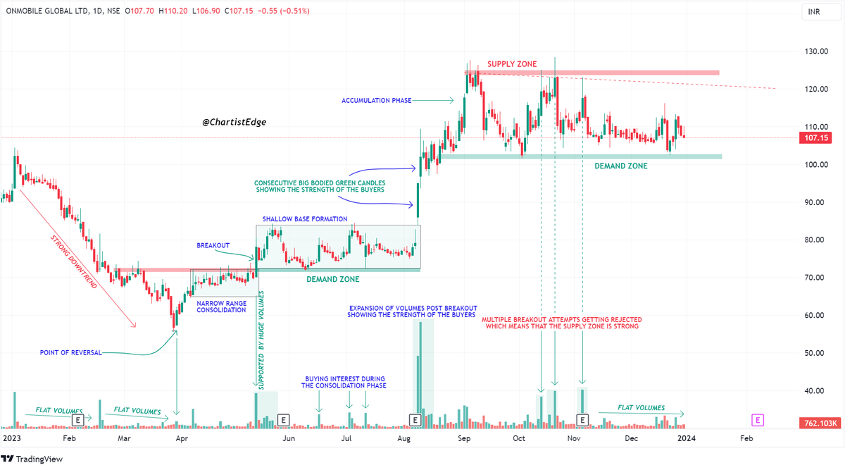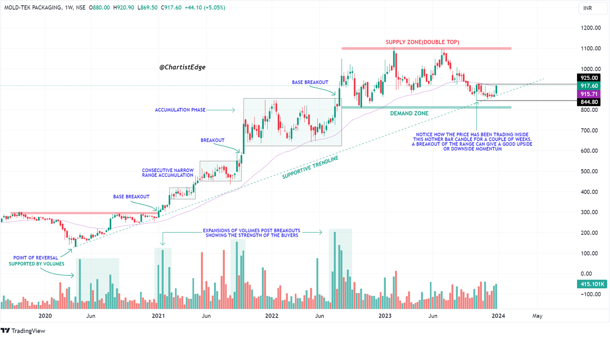 ā¢Long base formation with volatility contraction. Also, the price has been squeezed into a tight range as seen in the chart