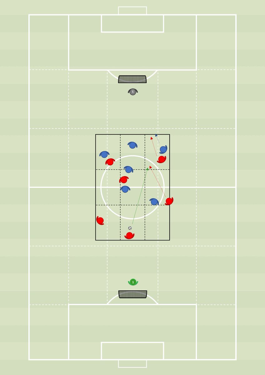 This exercise implicitly trains this principle. Starting in a 3x3 grid the red team attacks the top goal and blue the goal at the bottom. The end of the grid is also the offside line. 8 seconds of possession is 1 point, which forces the defenders to press. A goal is 3 points.