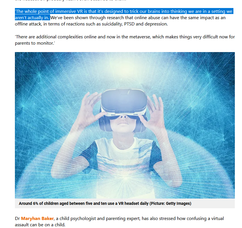 "‘A child might have been manipulated to be in that situation. When an attack takes place, we often see the ‘fight, flight or freeze” response. In a case like a virtual rape, a young person can be so shocked that ripping the headset off probably hasn’t even occurred to them.".
