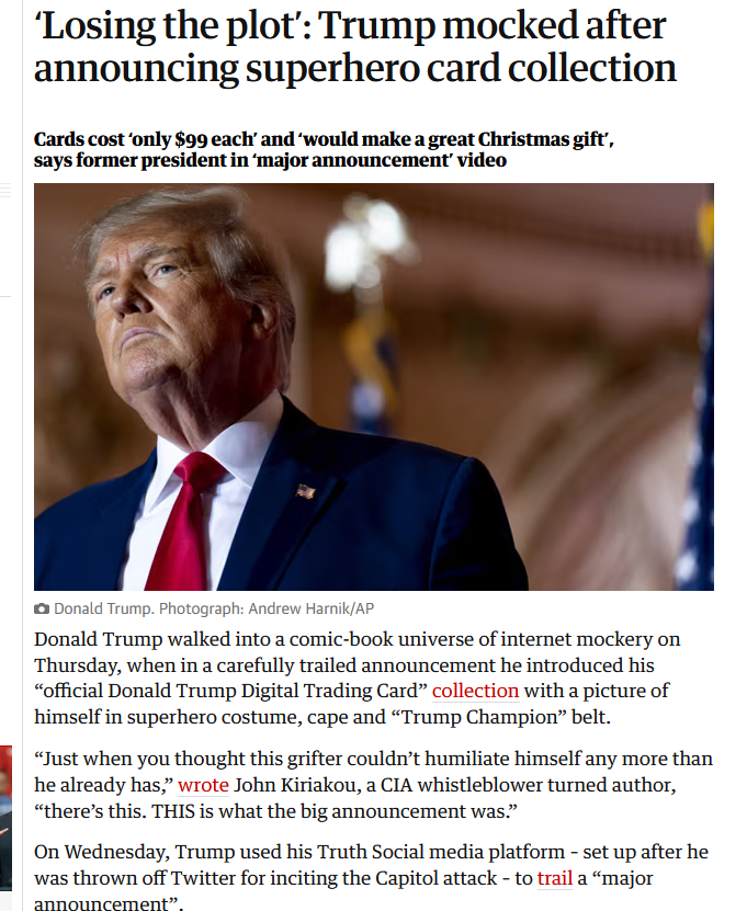 "On December 15, 2022, Donald Trump launched a series of digital art NFTs minted on the Polygon network for sale to the public for $99 USD each"