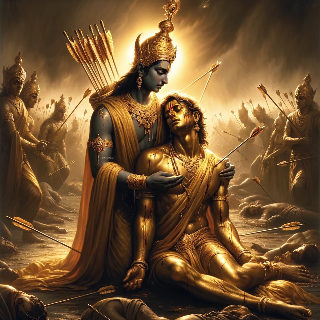 Karna's story raises profound questions about dharma (righteousness), destiny, and the nature of justice. His unwavering commitment to Duryodhana, despite the latter's adharma, highlights the dilemmas faced by individuals when loyalty conflicts with moral righteousness.
