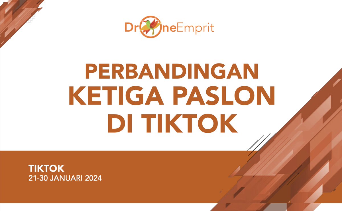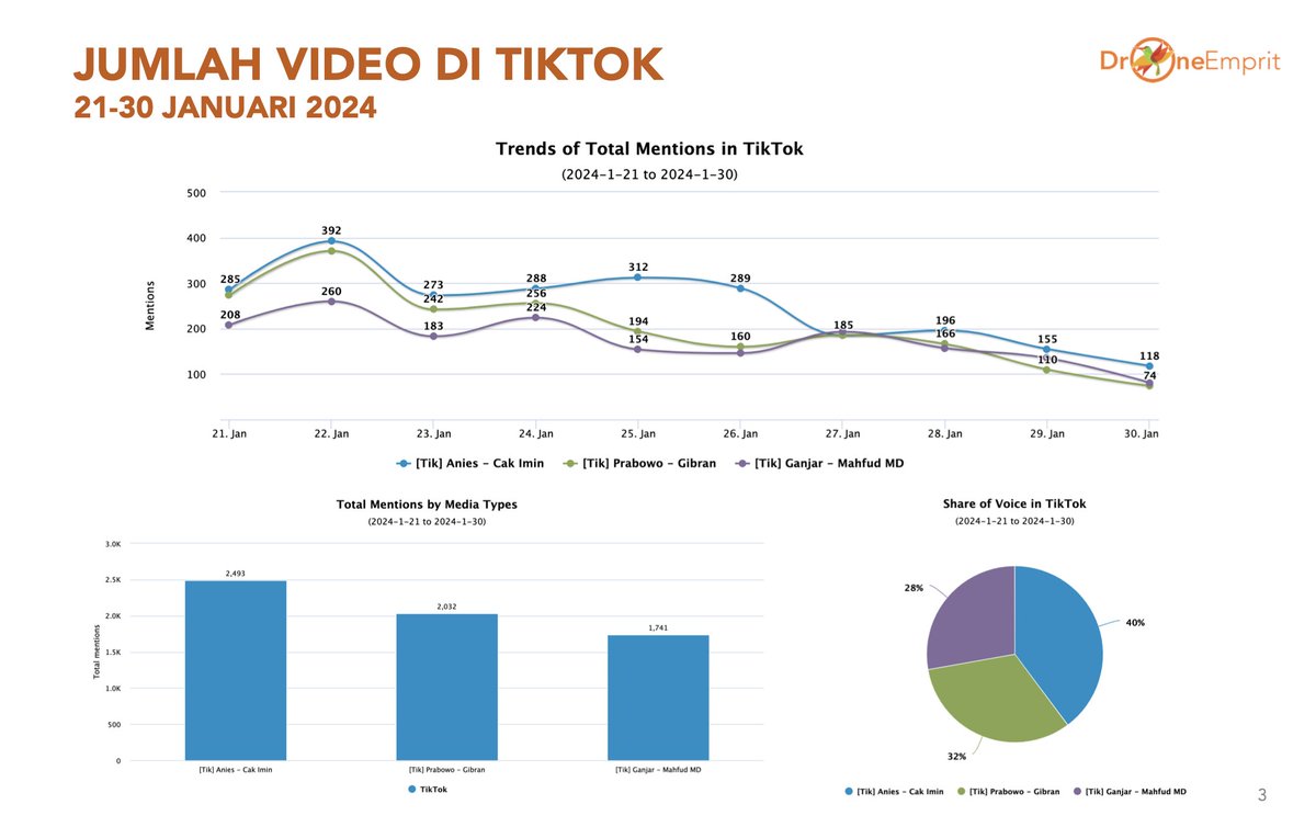 Pie chart menunjukkan bahwa Anies - Cak Imin memiliki 'Share of Voice' terbesar di TikTok dengan 40% dari total sebutan, diikuti oleh Prabowo - Gibran dengan 32%, dan Ganjar - Mahfud MD dengan 28%.