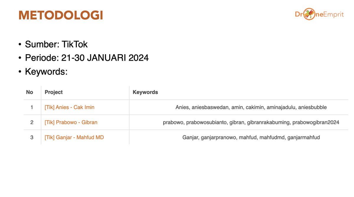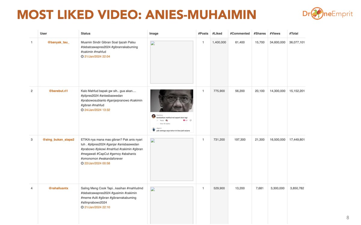 Dari data yang disediakan, "Anies-Cak Imin" memiliki jumlah post terbanyak (2,504 posts), diikuti oleh "Prabowo-Gibran" (2,042 posts), dan "Ganjar-Mahfud MD" dengan jumlah post terkecil (1,755 posts). Ini mungkin menunjukkan frekuensi konten yang lebih tinggi atau periode kampanye yang lebih lama untuk "Anies-Cak Imin".