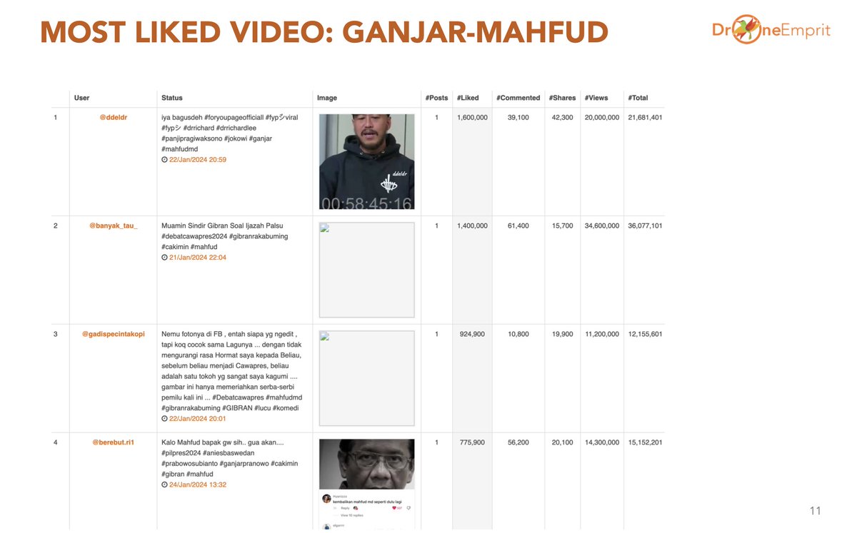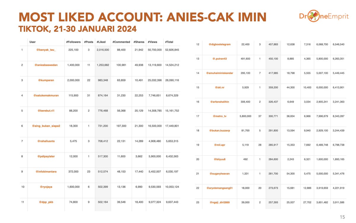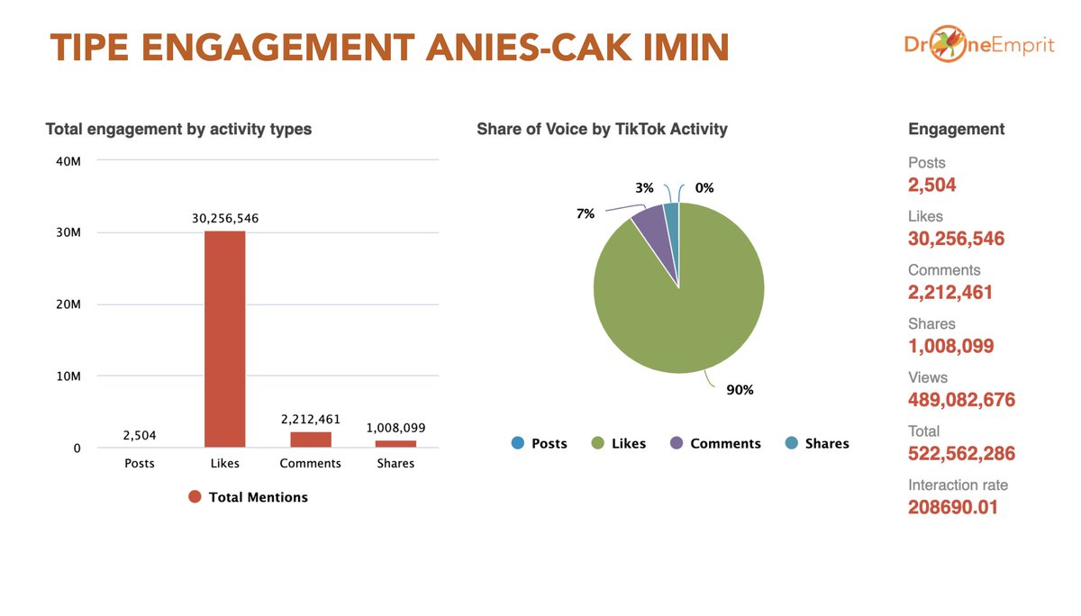 Anies - Cak Imin: Mereka memiliki total interaksi sebesar 516,899,152. Ini menunjukkan tingkat keterlibatan yang signifikan tetapi merupakan jumlah terendah di antara ketiga entitas.