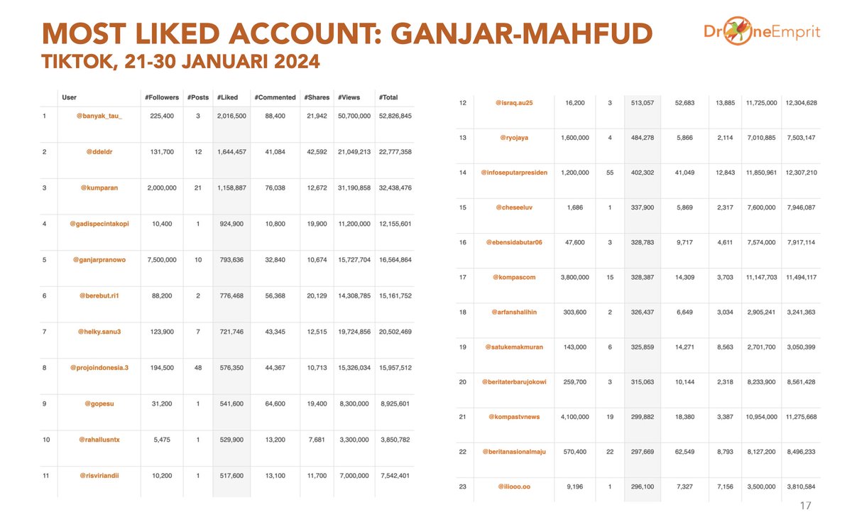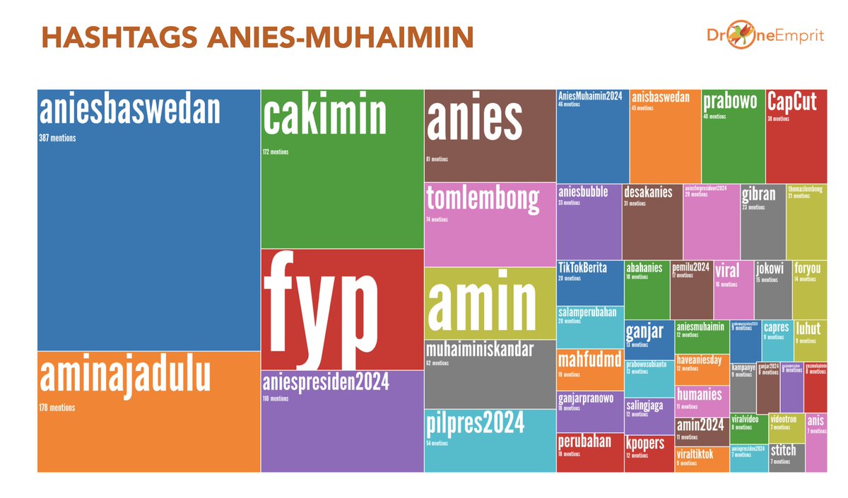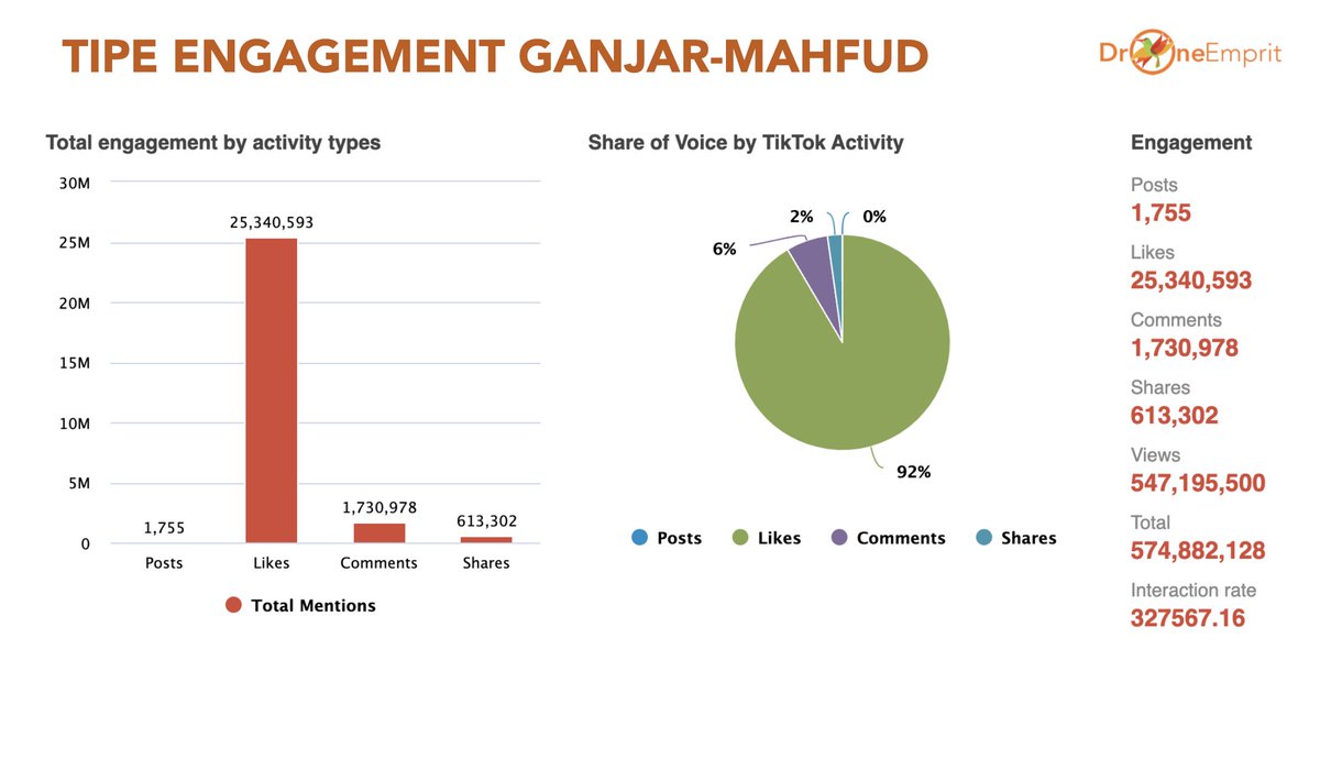 Meskipun "Anies-Cak Imin" memiliki jumlah post terbanyak, "Prabowo-Gibran" memiliki total engagement tertinggi (1,277,143,952), yang jauh melebihi yang lain. Hal ini menunjukkan bahwa meskipun mereka memiliki jumlah post lebih sedikit, setiap post mereka mendapatkan resonansi dan interaksi yang lebih besar dari audiens. "Ganjar-Mahfud MD", meskipun memiliki jumlah post paling sedikit, memiliki total engagement yang tidak jauh berbeda dengan "Anies-Cak Imin".
