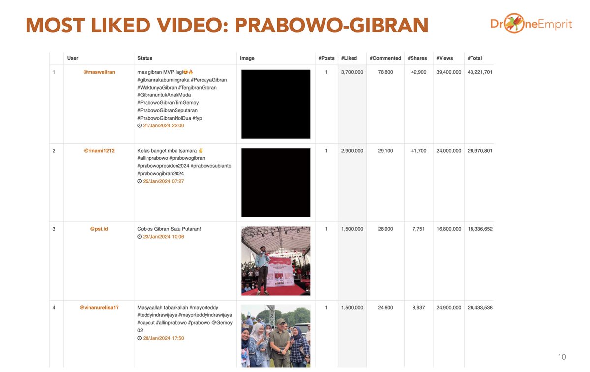 Prabowo - Gibran: Entitas ini memiliki jumlah interaksi tertinggi dengan total 1,271,642,826. Ini menandakan bahwa mereka memiliki keterlibatan yang sangat tinggi di TikTok, mungkin karena peristiwa penting, aktivitas kampanye, atau keberhasilan strategi konten yang mereka terapkan pada periode tersebut.
