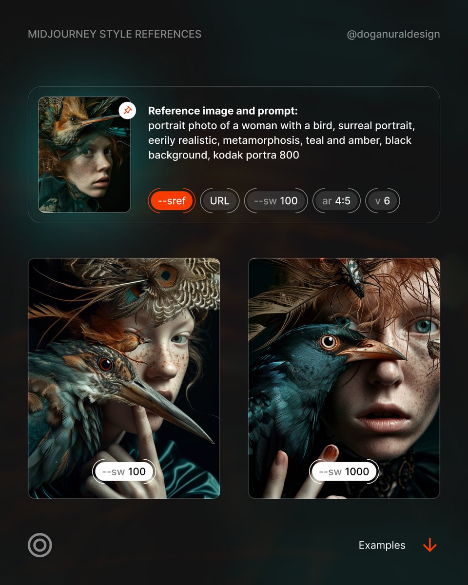 portrait photo of a woman with a bird, surreal portrait, eerily realistic, metamorphosis, teal and amber, black background, kodak portra 800 --ar 4:5 --style raw --sref s.mj.run --sw 100 --v 6