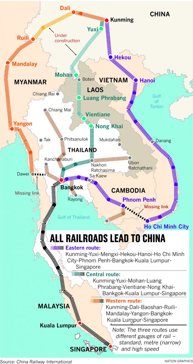 China is already dominating ASEAN, the central route from China's Yunnan through Laos to Thailand is half way there.