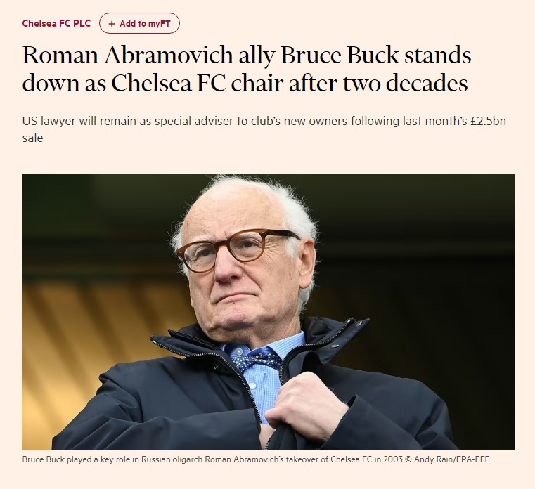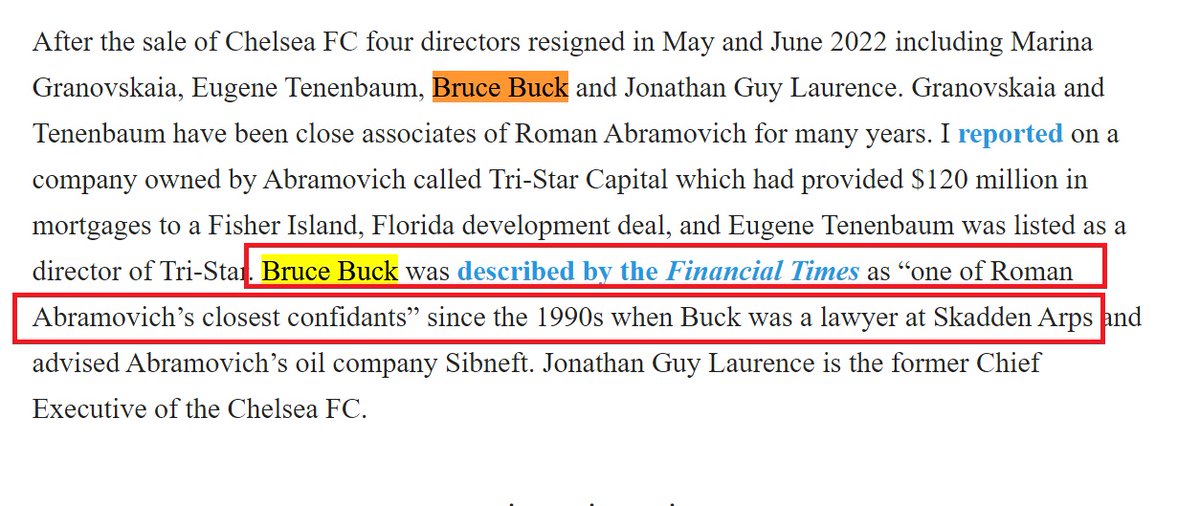 "Bruce Buck was described by the Financial Times as “one of Roman Abramovich’s closest confidants” since the 1990s when Buck was a lawyer at Skadden Arps and advised Abramovich’s oil company Sibneft."