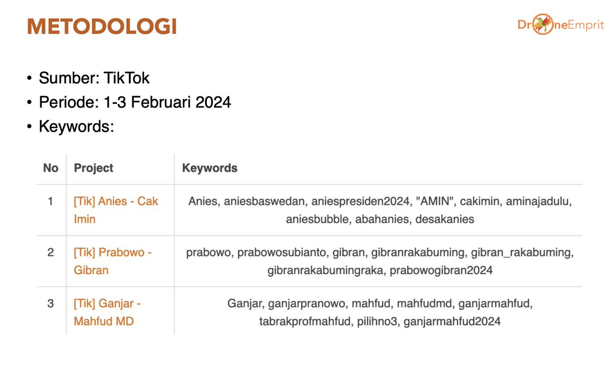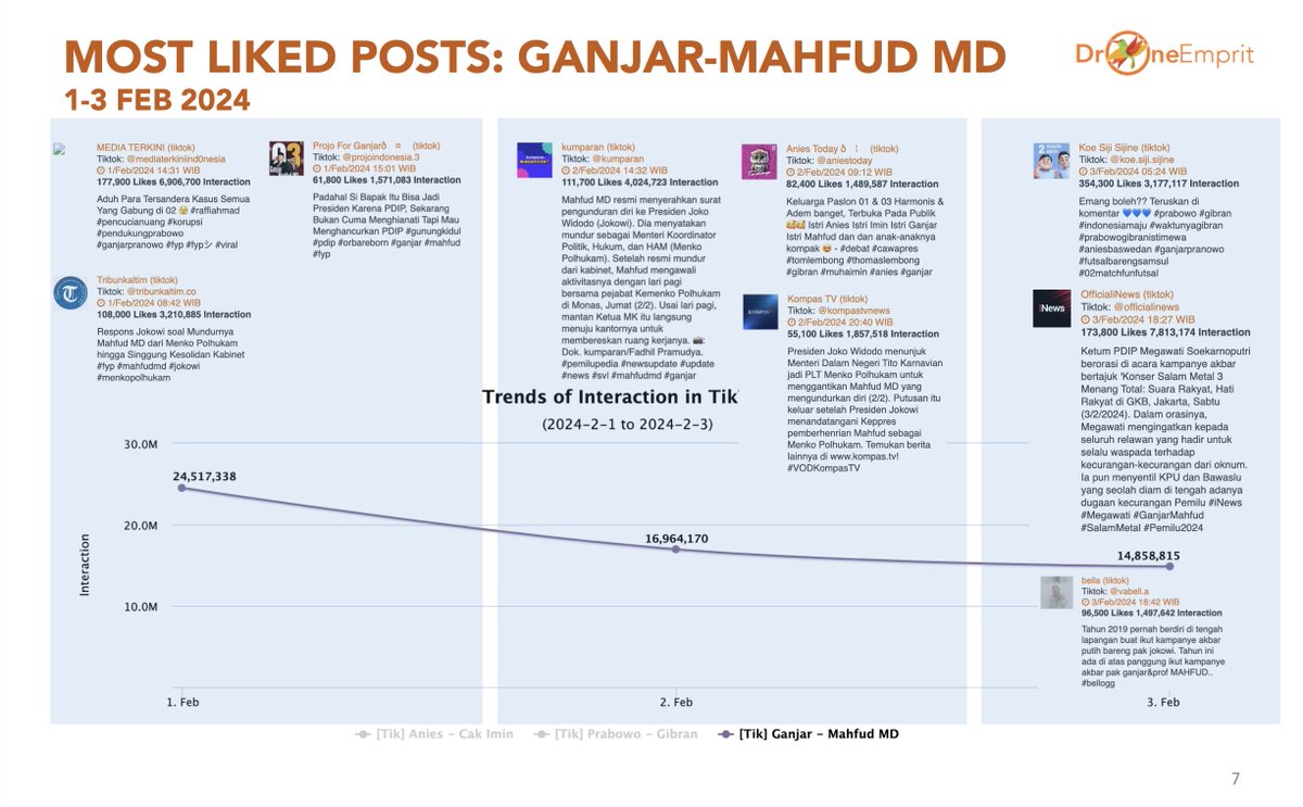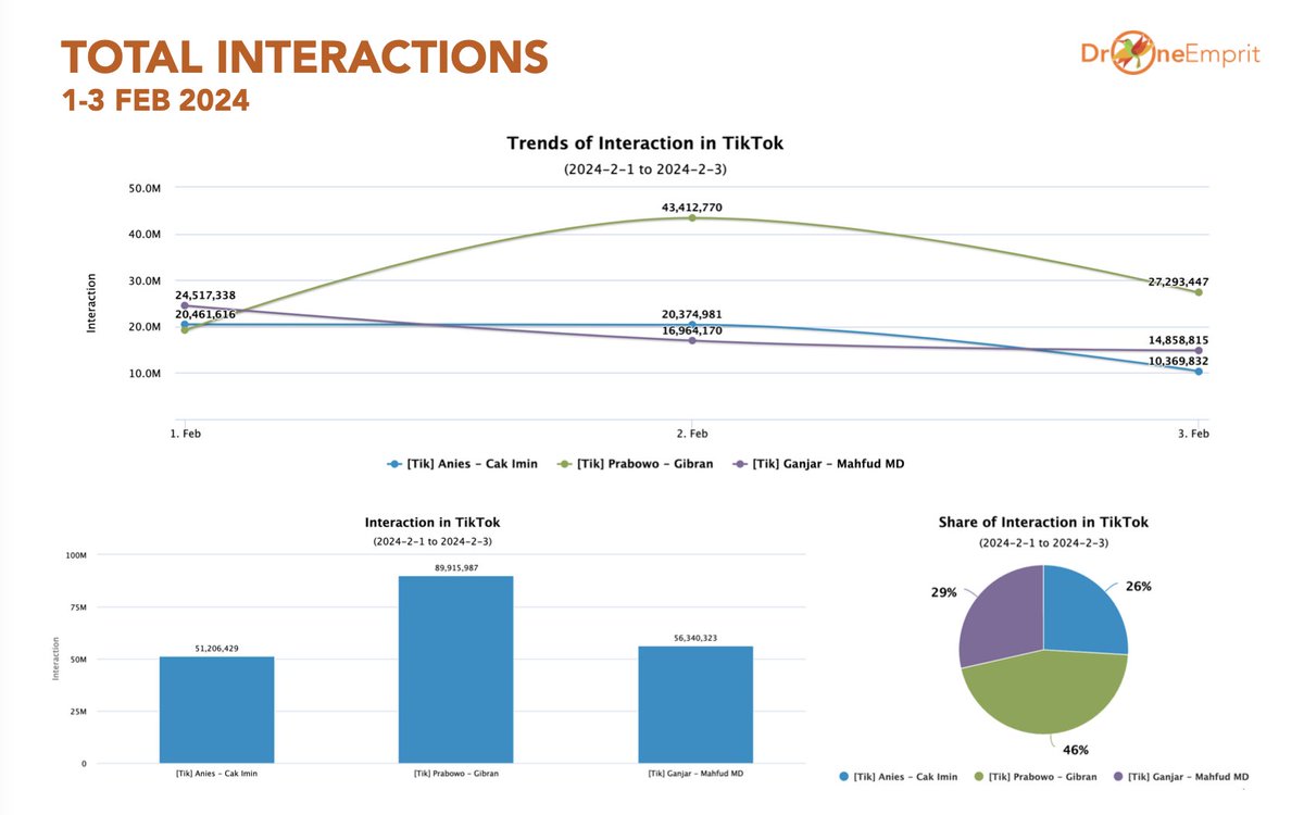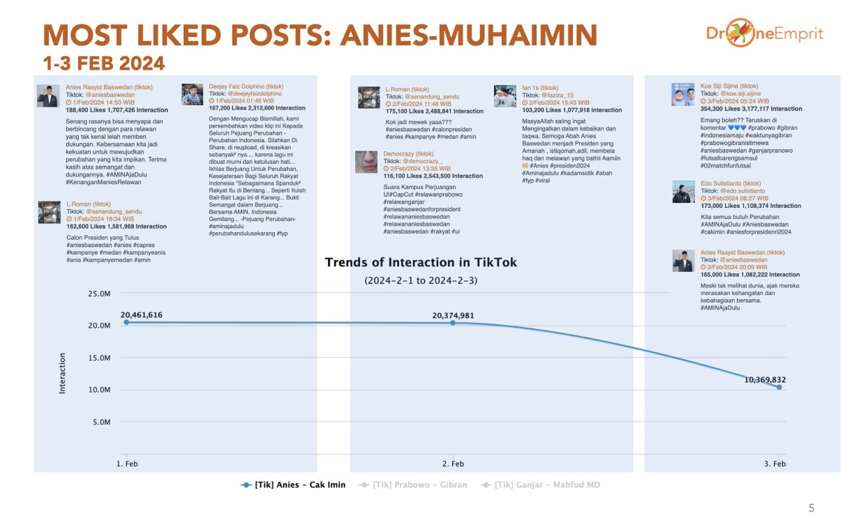 Pasca Anies live di TikTok tanggal 1 Februari 2024, jumlah postingan konten di TikTok meningkat untuk Paslon 01, mengalahkan Paslon 02 dan Paslon 03. Namun jumlah interaksi yang didapat belum berbanding lurus dengan jumlah kontennya.
