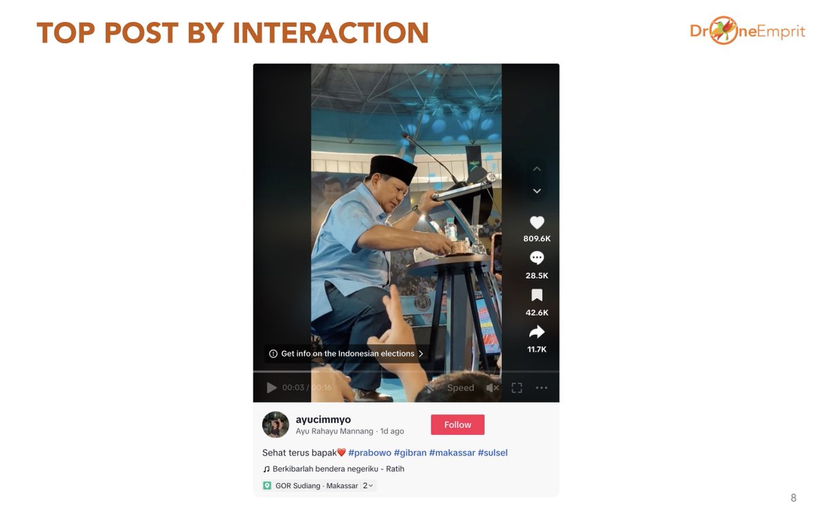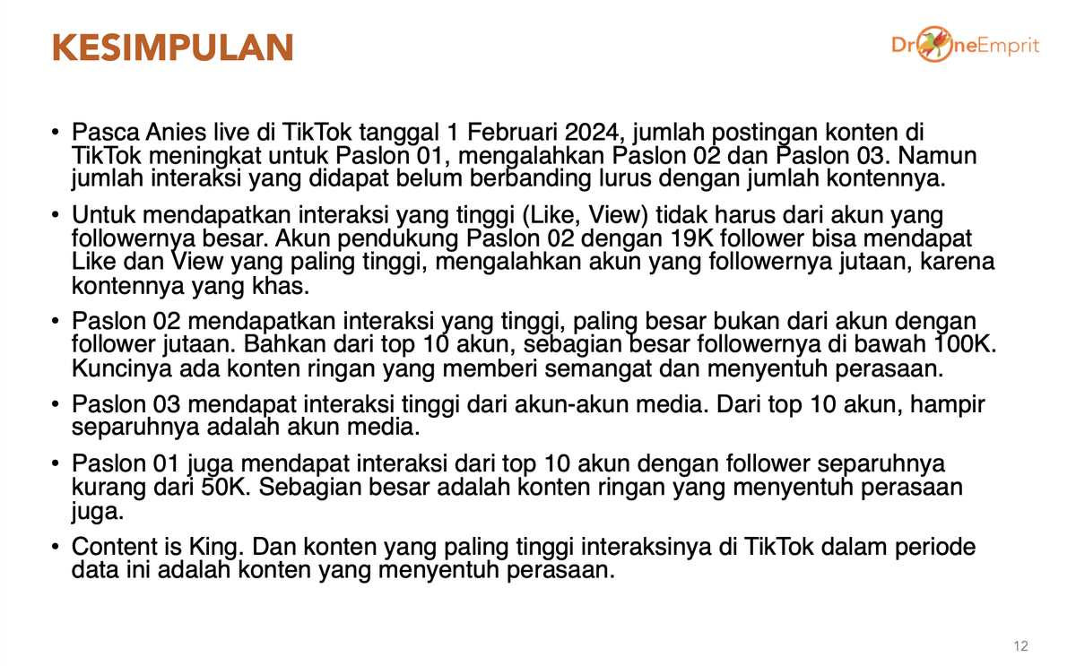 Paslon 02 mendapatkan interaksi yang tinggi, paling besar bukan dari akun dengan follower jutaan. Bahkan dari top 10 akun, sebagian besar followernya di bawah 100K. Kuncinya ada konten ringan yang memberi semangat dan menyentuh perasaan.
