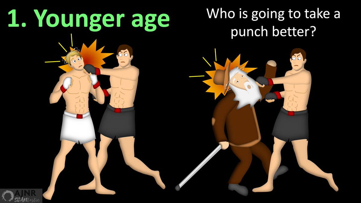 14/First was younger age. This makes sense. Ischemia is an insult to brain, like a punch is to the face. Who will better recover from a punch to the face—you or your 90-year-old grandfather? Younger brains have more capacity to survive under adverse conditions.