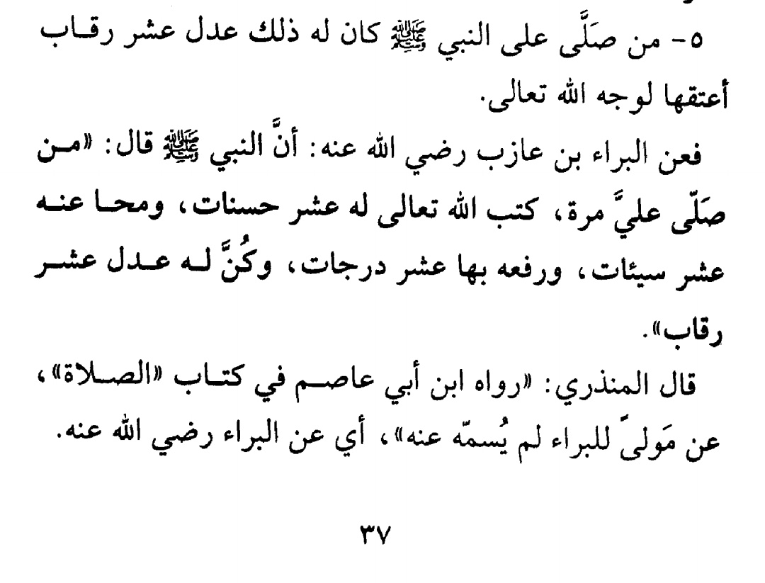 5. Barangsiapa bershalawat kepada Nabi Muhammad Saw hal itu sama halnya dengan memerdekakan 10 budak karena Allah. Referensinya