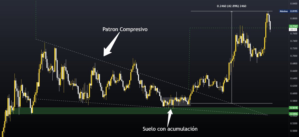 1- Buscas cryptos en rango compresivo formando un suelo y compras su rotura.
