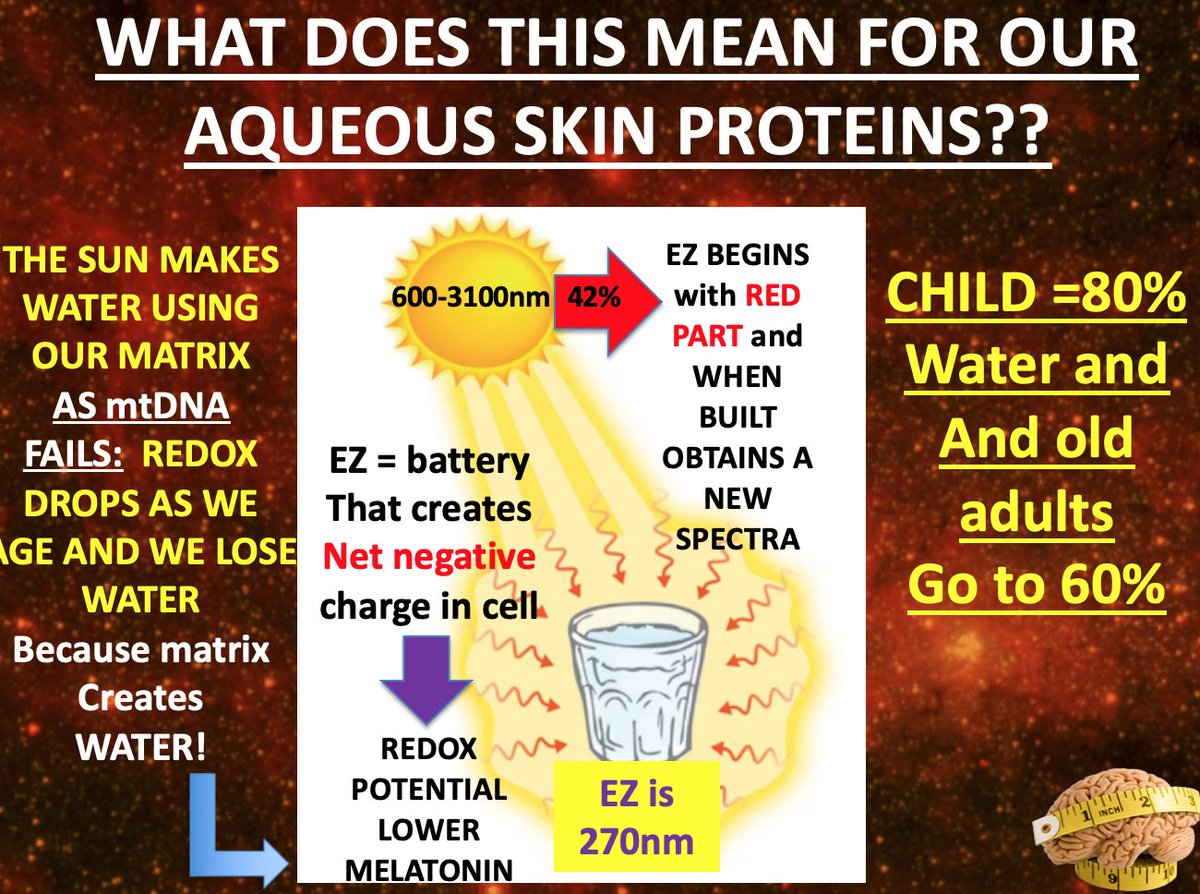 21. Liquid water on Earth is quantum coherent even at ordinary temperatures and pressure. This is why Nature got the idea to build cells around liquid water. It is a naturally formed quantum computer functionally. Liquid water made in the mitochondrial matrix is the most wonderous chemical Nature has ever built because the water forms more coherent domains than the water from the hydrology cycle. Even latitude variation shows how water homogeneity changes as solar inclination affects its molecular arrangements and bond angles. Mitochondrial matrix water associates with macromolecules and membranes in cells into a gel-liquid crystalline configuration that enables enzymes and nucleic acids to function as quantum molecular machines that transform and transfer solar energy at close to 100% efficiency. Liquid crystalline water at interfaces also provides the excitation energy that enables it to split into hydrogen and oxygen in photosynthesis, simultaneously generating electricity for intercommunication and for the redox chemistry that ultimately powers the entire biosphere on the 3rd rock from the sun.