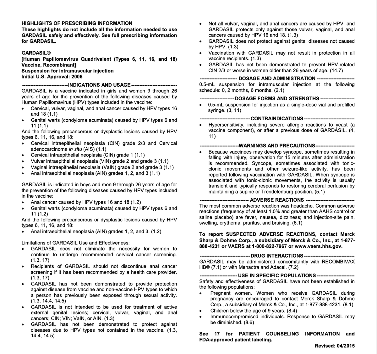 The Gardasil clinical trials had a long list of criteria that needed to be met for someone to participate. They were not allowed to participate in the trials were people with: severe allergies; prior abnormal Pap test results; over four lifetime sex partners; a history of immunological disorders and other chronic illnesses; reactions to vaccine ingredients, including aluminum, yeast, and benzonase; or a history of drug or alcohol abuse. The only problem with this is that Merck and the FDA now recommends Gardasil for all of these groups. There haven’t been studies done with individuals that fall into those categories so how can they know it ok to recommend?
