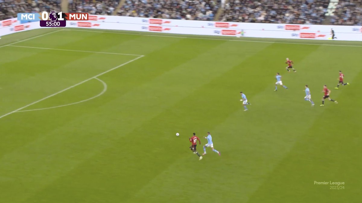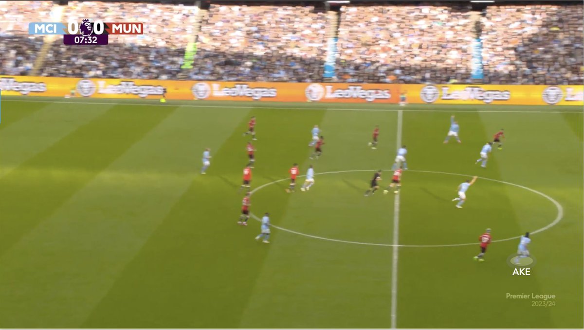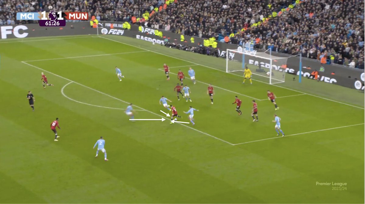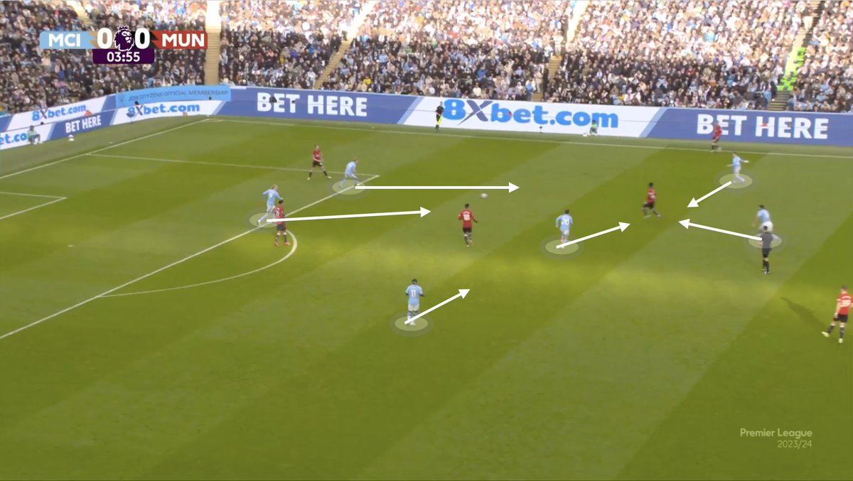 McTominay and Fernandes were tasked with dropping back to create a 4v4 in central midfield. The team maintained a compact shape that prevented the opponent from making central progressive passes. However, they didn't apply much pressure on the ball, which allowed City to consistently build their attacks from these areas.