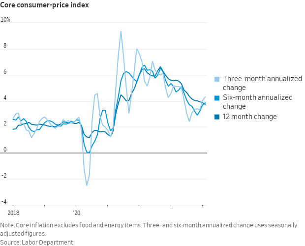 The core CPI rose 0.36% in February and was up 3.8% from a year earlier. The 6-month annualized rate was also 3.8%, and 3-month annualized rate was 4.3%.