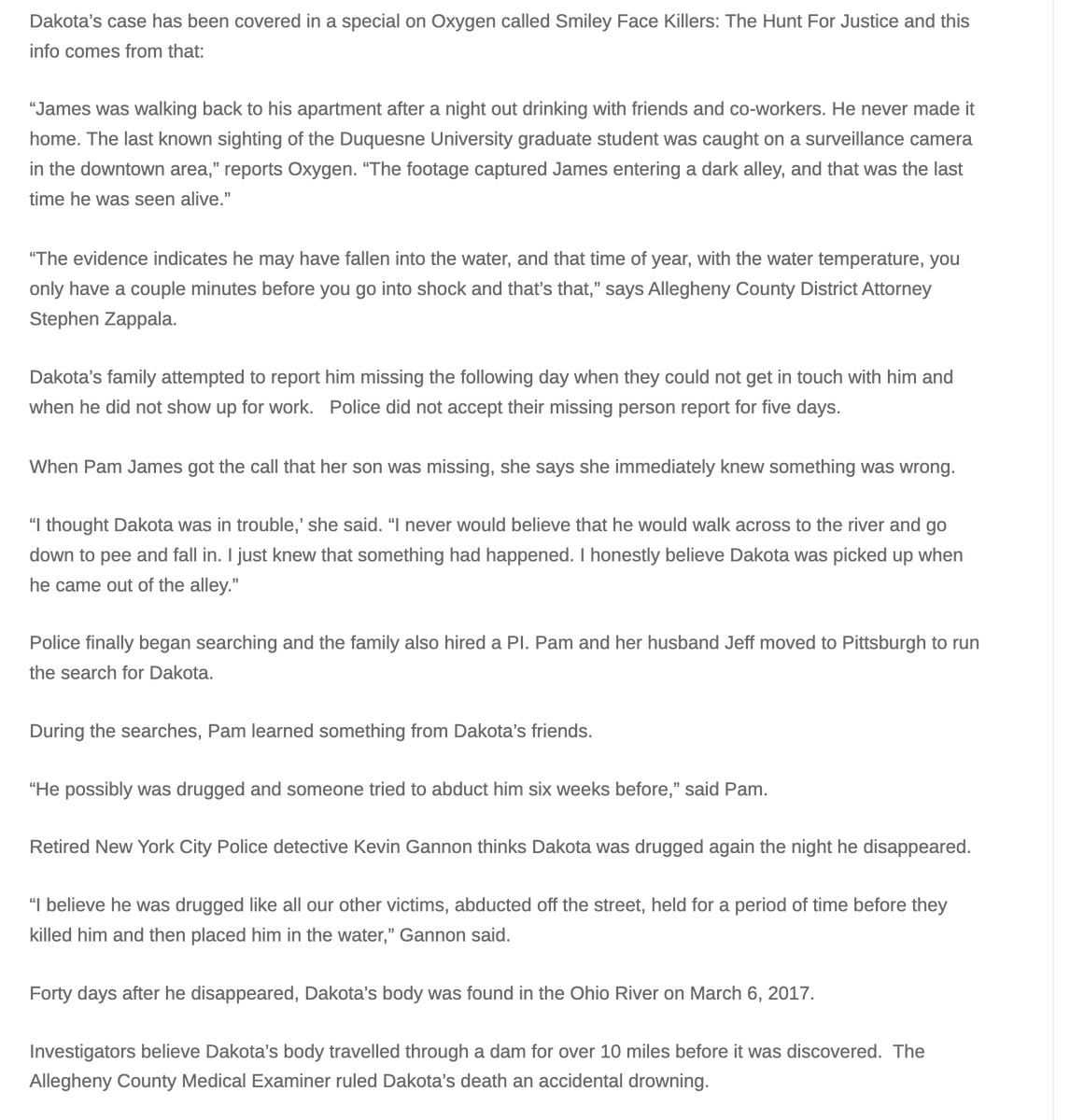 1) There are so many similarities between the disappearance and water deaths of Dakota James and Riley Strain that I thought I'd post some info from Dakota's family after the discovery of their son in the Ohio River.