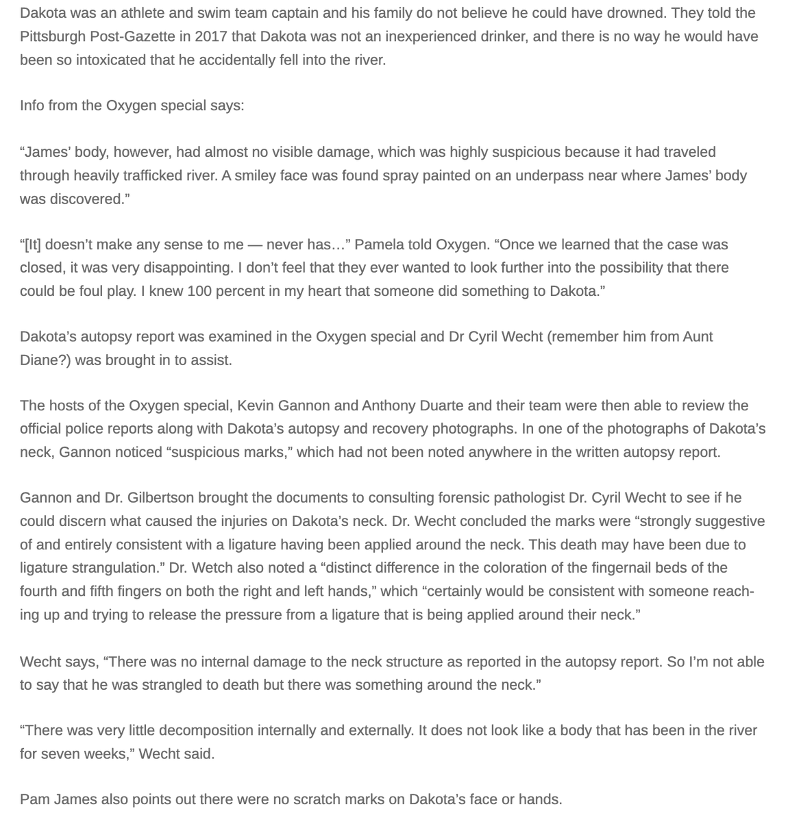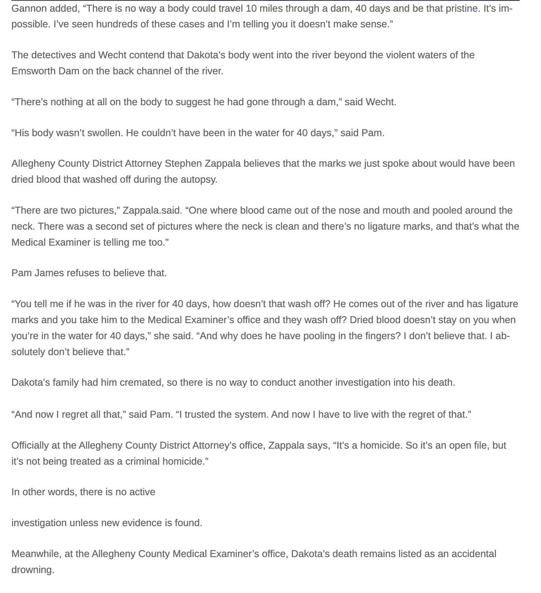 6) Dakota's family had him cremated, so there is no way to conduct another investigation into his death.