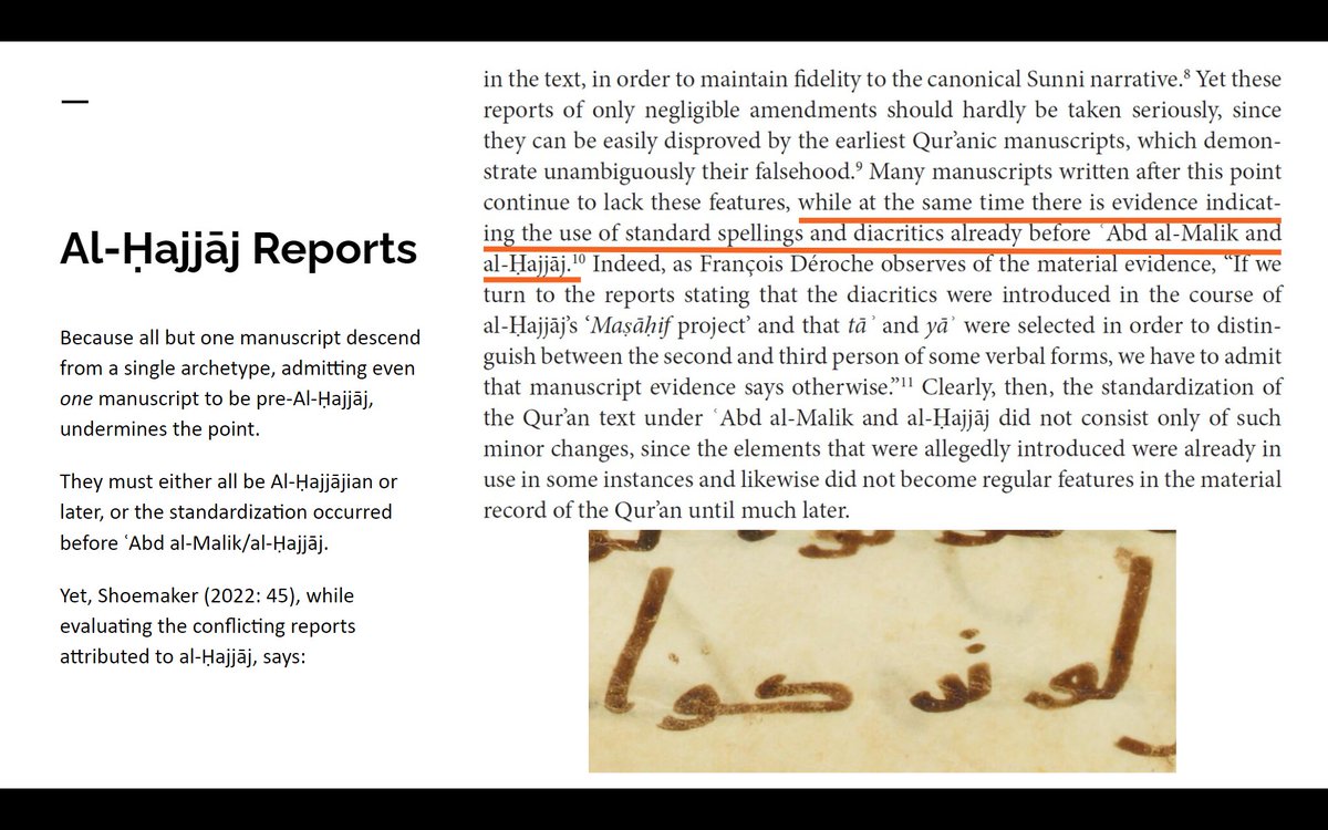 Shoemaker seems to be confused about this. He cites positively Déroche who dismissed the accuracy of the reports of what ʿAbd al-Malik did (Shoemaker imagines ʿAbd al-Malik did much more). But Déroche's argument ONLY works with the existence of pre-ʿAbd al-Malik manuscripts.