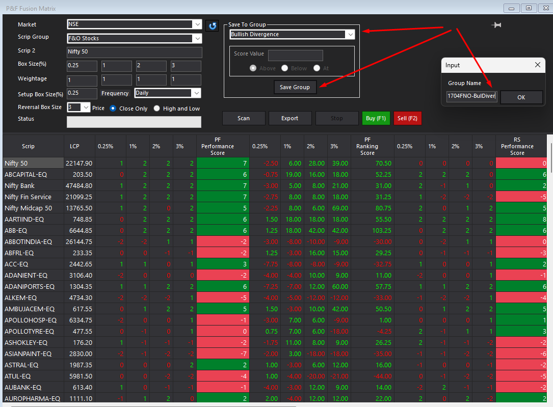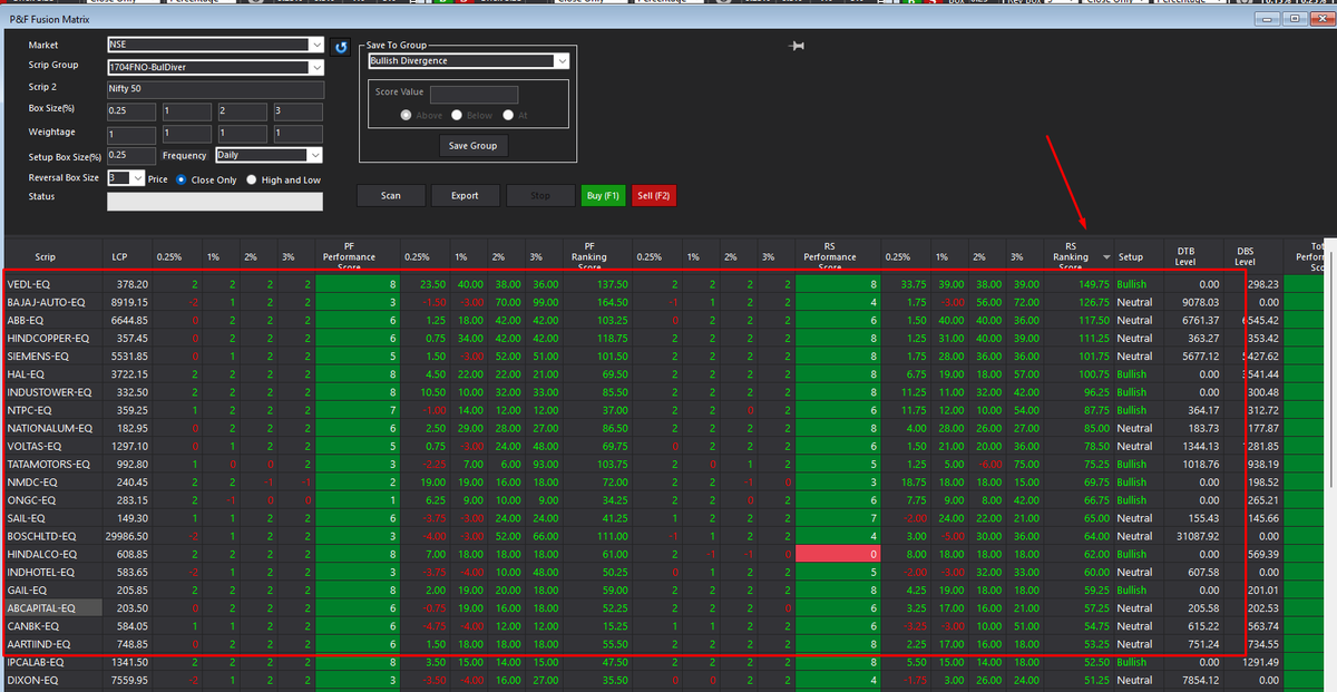 2) Save it into a group for stocks having bullish divergence in RS charts vis-a-vis price charts