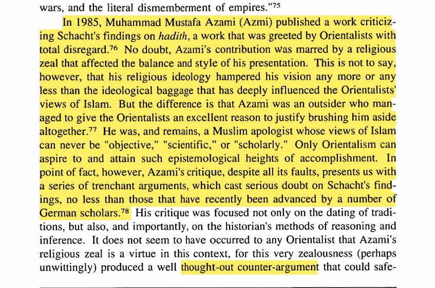 findings Motzki is an exception case, others like Crone, Cook etc did criticized Schacht but literally all of them followed them followed the same negative story and were adding more to it. Orientalism has always treated outside critiques by brushing