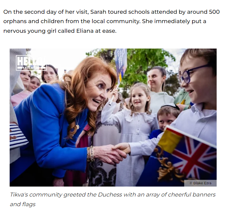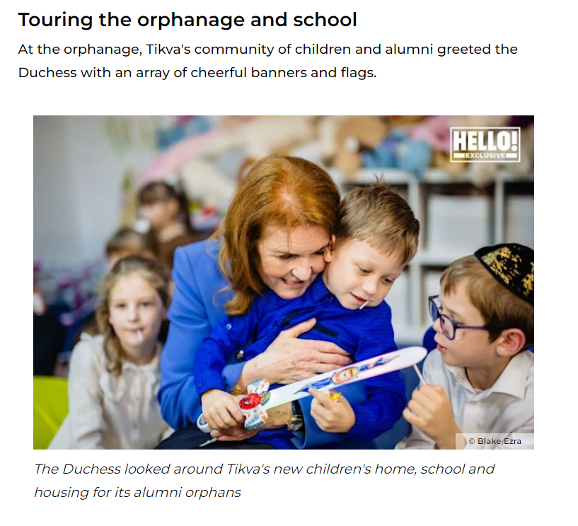 "During a two-day visit – and accompanied every step of the way by HELLO! – Sarah met Ukrainian refugees as she toured the Tikva orphanage"..