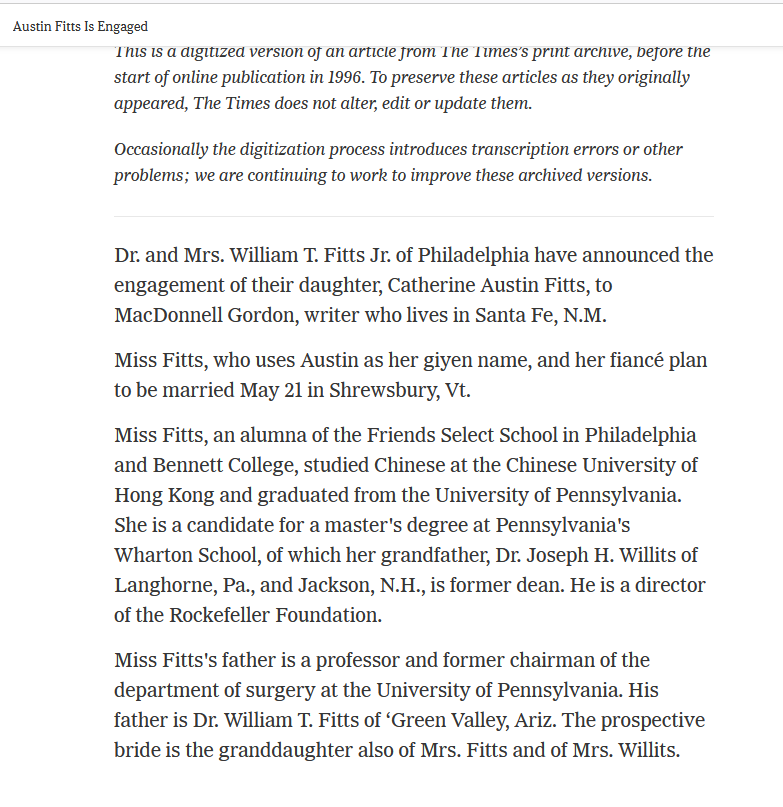 "The future bride is a granddaughter of Dr. William T. Fitts, and Mrs. Fitts and Dr. and Mrs. Joseph H. Willits of Langhorne, Pa., and Jackson, N.H. Dr. Willits was a dean at the Wharton School and a director of social sciences at the Rockefeller Foundation."