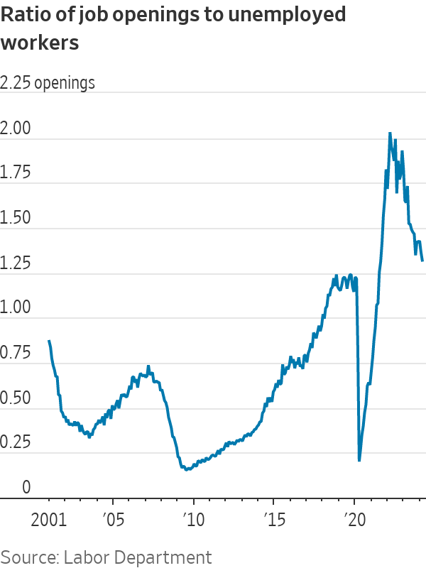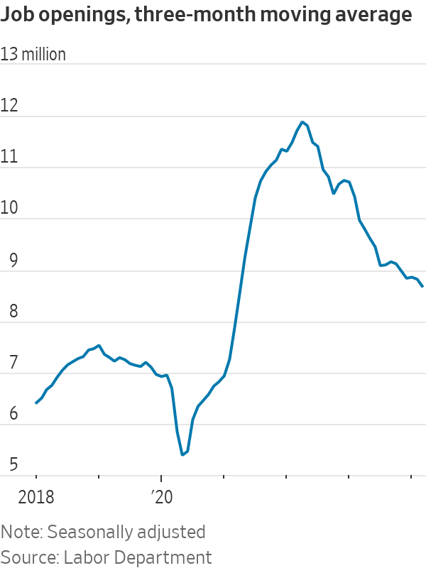 The private-sector job vacancy rate fell to 5.3% in March, the lowest level since January 2021 There were 1.3 vacancies for every unemployed worker in March, the lowest since August 2021