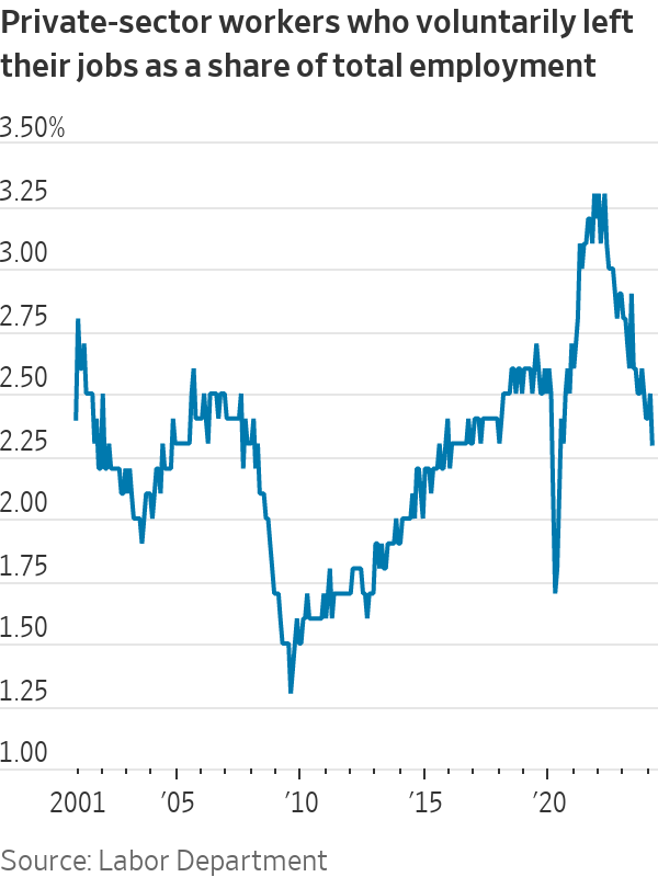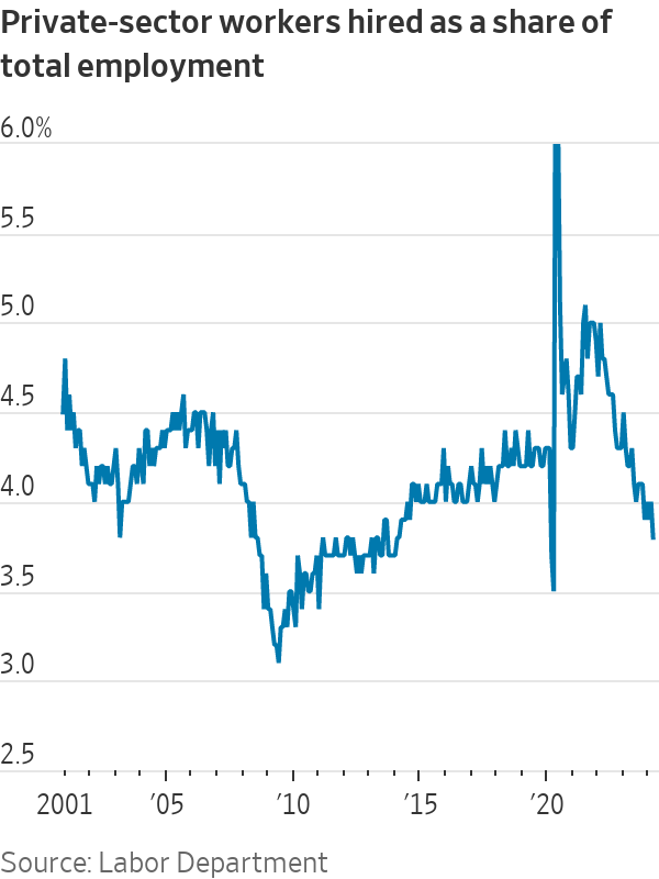 The private-sector hiring rate fell to a 10-year low of 3.8% in March The quits rate also declined further to 2.3%, below its pre-pandemic level And layoffs remained low at 1.1%