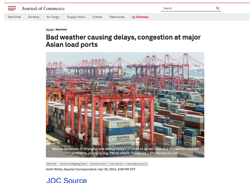 Also, in mid-April port congestion surged with poor weather—heavy fog in two of China’s biggest ports Shanghai and Ningbo, along with heavy rain in Malaysia and Singapore. Global shipping is a chaotic system in the literal sense as it depends on the weather and even the earth’s geology (volcanos etc)