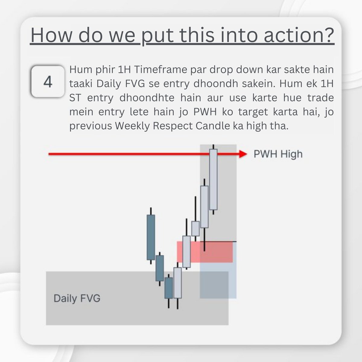 6 - Here we take a look at a 4 step example of this theory in action. First we start off with identifying a Weekly Candle, finding the target and then identifying a Daily PD Array to trade off of.
