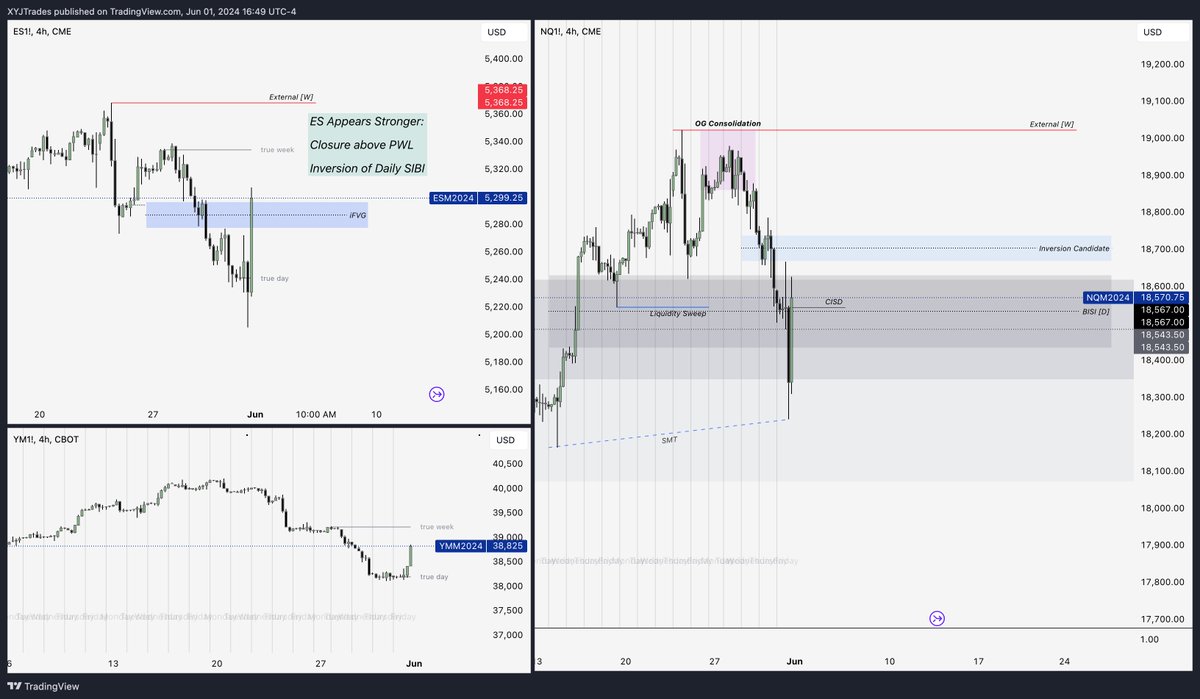 H4 Time Frame + Consideration of ES Protocol: Market Maker Buy Model ES appears stronger for two reasons: 1. Closure above PWL 2. Inversion of Daily SIBI on Friday May 31, 2024