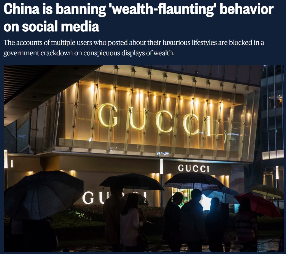 الصين تقرر حظر 8 حسابات تعود لمشاهير ومشهورات في وسائل التواصل الصينية لتفاخرهم بثرواتهم أمام متابعيهم وفق قانون يفرض عدم التباهي بالثروة وإظهار أسلوب حياة فاخر في وسائل التواصل حتى لا يلحقوا الضرر نفسياً على أصحاب المستوى المعيشي الأقل.