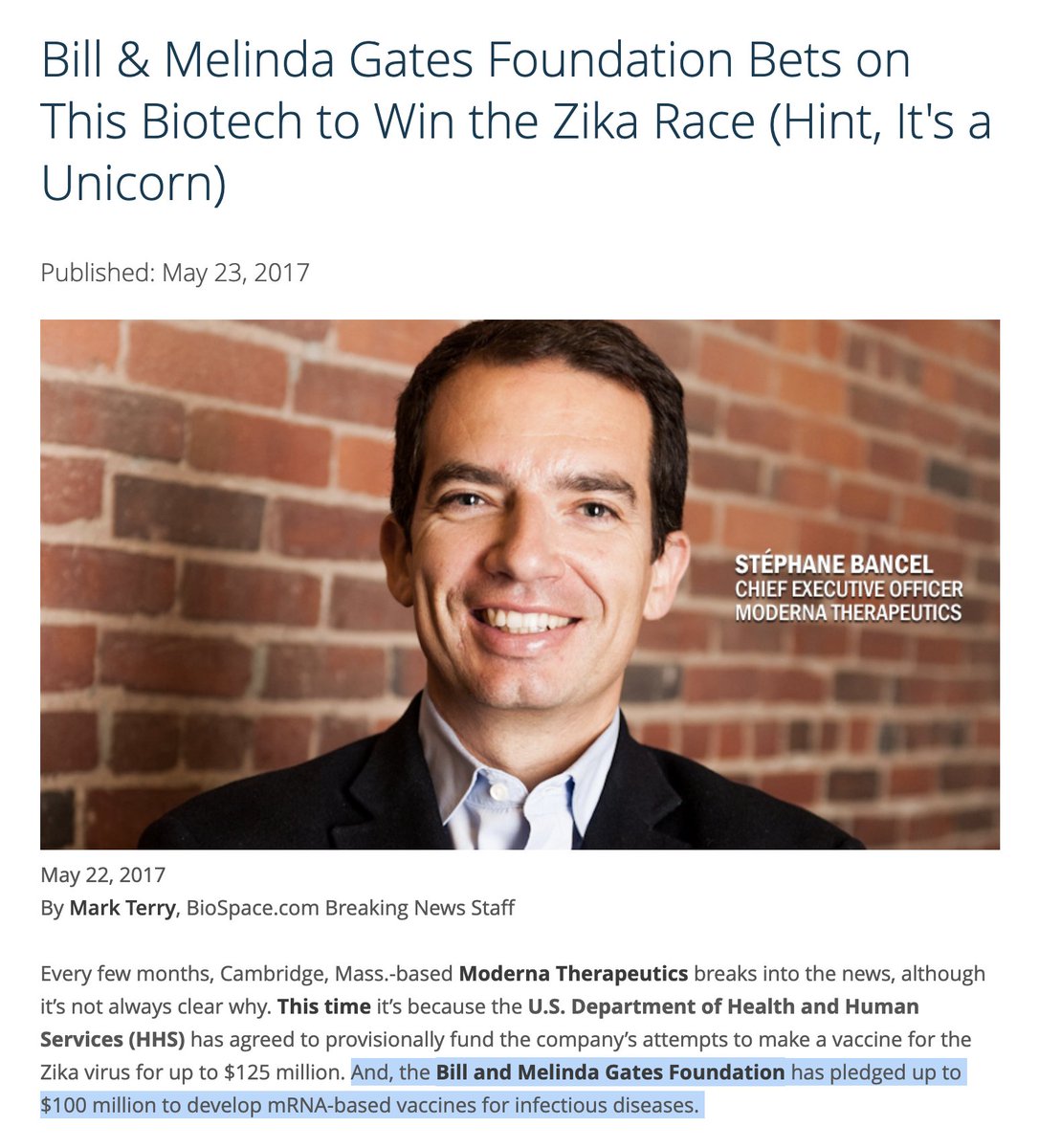 Also in 2017, the Gates Foundation pledged up to $100 million for Moderna to develop mRNA-based vaccines for infectious diseases, including Zika virus.