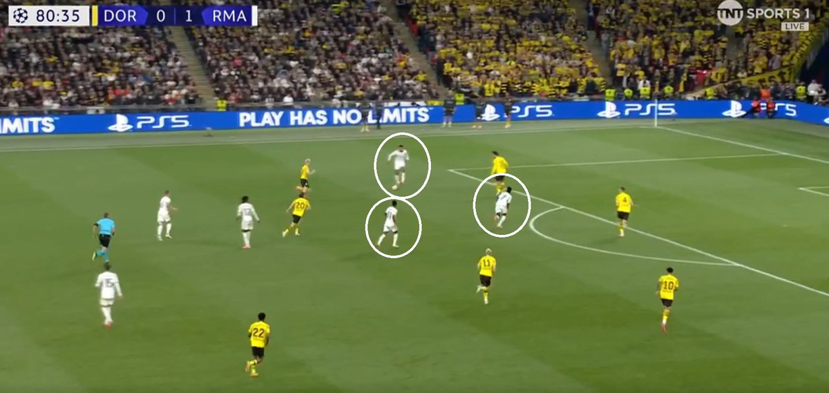 Por eso de a momentos pareciera que cuando manejan el balón faltase de esa creatividad de uno de los del medio (JB) para poder desarrollar con más facilidad la jugada y que no dependa solamente de Vini o Rodrygo, sino que sea un conjunto.