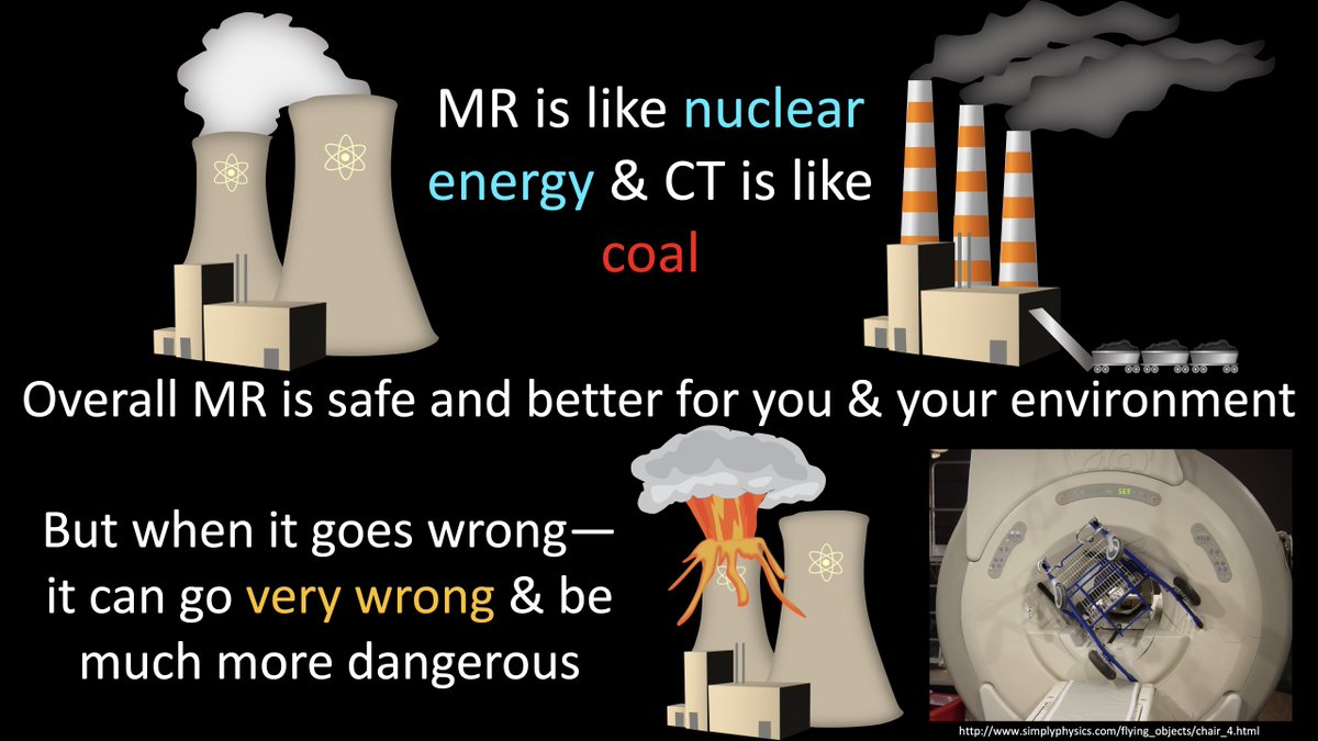 2/MRI & CT are like nuclear & coal power, respectively. Everyone knows CT is worse for you & usually MRI is very safe & better for your body But like nuclear power, when things go bad in MRI, they can go horribly wrong. Flying chairs into the magnet wrong. So, people are afraid.