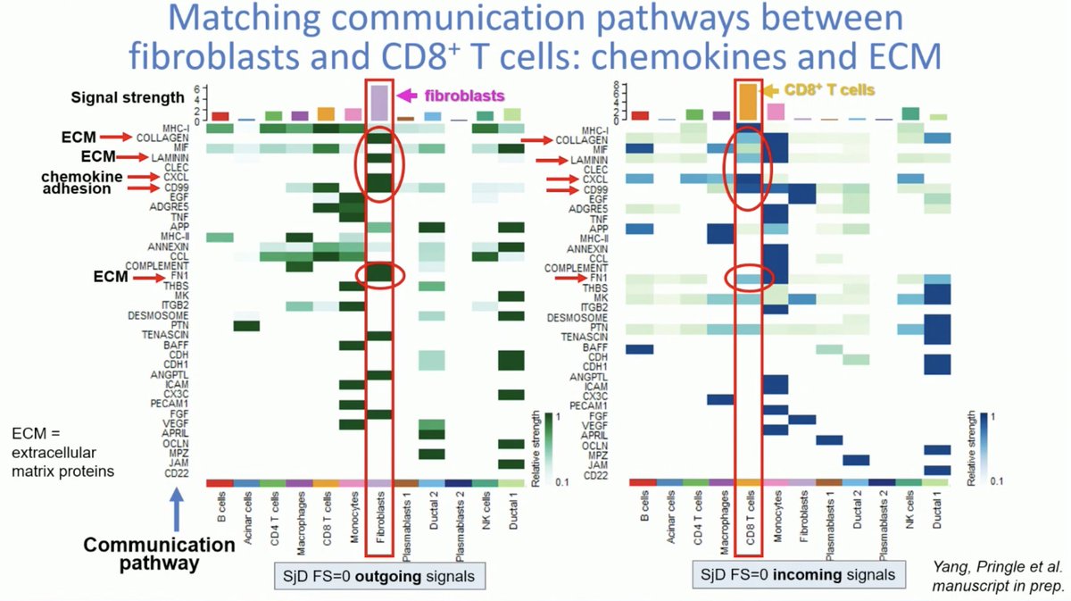The communication pathways between fibroblasts and CD8+ T cells are enriched for chemokines and ECM components.