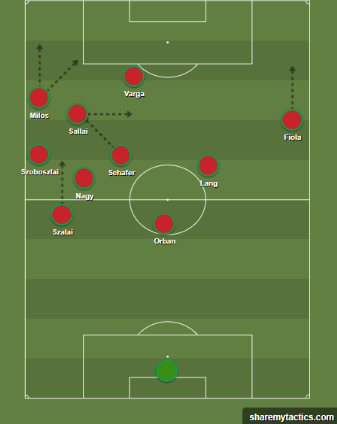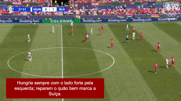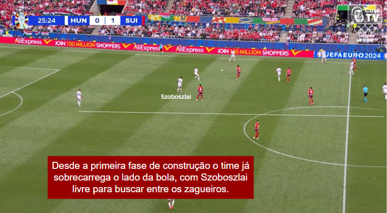 Toda essa influência dinizista e os príncipios extremamente relacionais foram vistos na estreia contra a Suíça. “Paralela cheia”, escolher um lado, juntar-se exageradamente nele e atacar por ele, movimentos amplos, associações curtas, tocar e andar e liberdade total para que os meias – principalmente Szoboszlai – participem da 1a fase de construção.