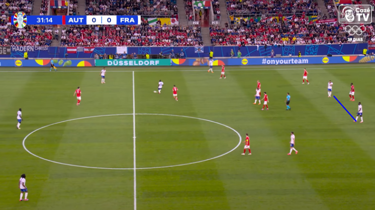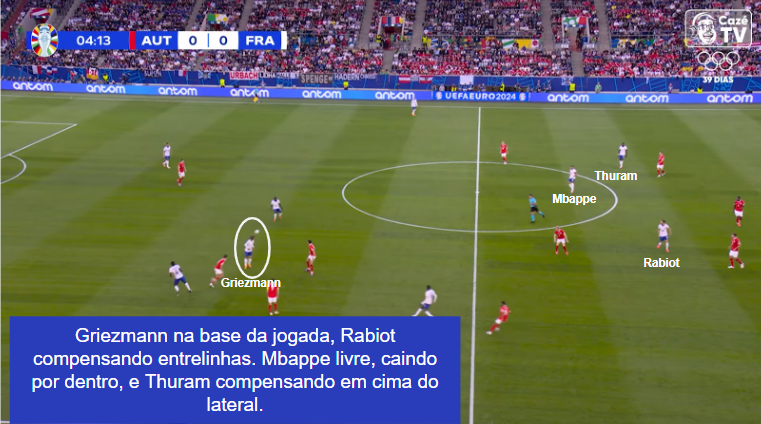 A capacidade de adaptação de Deschamps é incrível. A equipe parte do mesmo 4-3-3 da Copa, mas com ligeiras diferenças. Dessa vez, o time é ainda mais visivelmente construído ao redor de Griezmann e, principalmente, Mbappe. Arte na mestre das compensações, Deschamps escala Thuram como compensador de Mbappe e Rabiot como compensador de Griezmann.