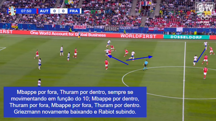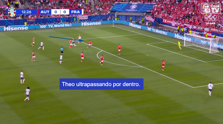 Mbappe e Thuram, nada logicamente, partem basicamente do mesmo espaço – o intervalo entre zagueiro e lateral canhoto –, mas para onde Mbappe vai (é completamente livre para decidir isso, aliás), Thuram compensa fazendo o movimento contrário. Kylian por fora, Thuram por dentro, Kylian por dentro, Thuram por fora. É assim também com Rabiot: se Griezmann baixa para buscar e ditar o ritmo, Rabiot se projeta. Além disso, jogam com pouca rigidez posicional e também sobrecarregam o setor da bola; Theo ultrapassa por dentro. Imagens!