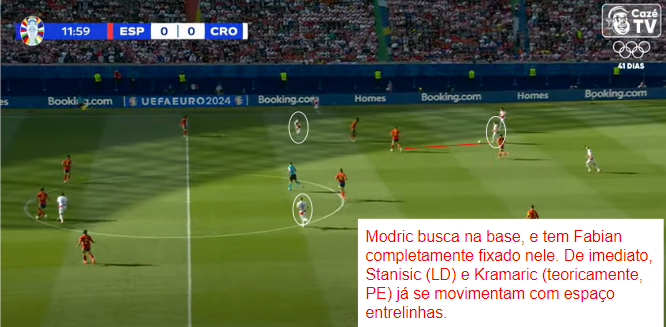 Reparem nas imagens. Modric hora está entrelinhas e hora na base, assim como Brozovic e Kovacic. Recebem por fora do bloco, tocam e se movimentam, se associam em diagonal, caem em pouquíssimos metros no setor da bola e controlam o jogo. À frente, o nove Kramaric joga como um digno falso-ponta atravessando o campo e os laterais, sobretudo Stanisic, aparecem por dentro e por fora. Sobrecarregam pelo lado direito.