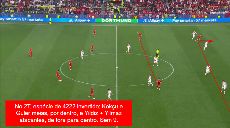 Vejam nas imagens. Atacam em uma espécie de 4-2-2-2 invertido, com os atacantes partindo de fora para dentro e Kokçu e Guler como meias internos. Circulam muito bem a bola, sobrecarregam pelos lados – principalmente na esquerda, inicialmente com Kadioglu, Kokçu e Yildiz, contando com a colaboração de Guler e Çalhanoglu —, jogam por dentro e dão liberdade para os meias aparecerem tanto na base quanto entrelinhas.