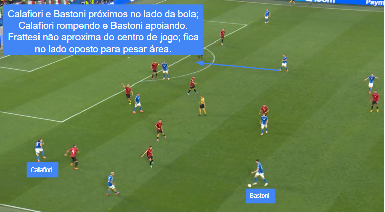 Scamacca e Frattesi variam entre o movimento de apoio e de ruptura, materializando as tabelas e ultrapassagens infiltrando na área. No lado oposto, Di Marco se mantém aberto, porém afunilando à medida que a posse avança e atacando a área, podendo também permutar com Pellegrini.