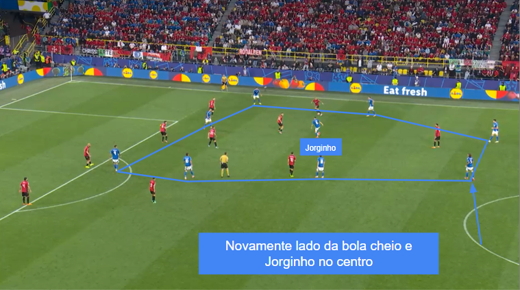 A referência é a bola. Quando na direita, Pellegrini cruza o campo até o centro do jogo e Calafiori – os zagueiros também são bem livres para participar – sobe em diagonal fazendo uma espécie de cerco. Jorginho e Barella se aproximam, com o ítalo-brasileiro como eixo, pegando a bola de frente, e o meia interista alternando entre a base e as proximidades da área. Di Lorenzo se projeta por dentro na maioria das vezes, mas também por fora para liberar Chiesa.