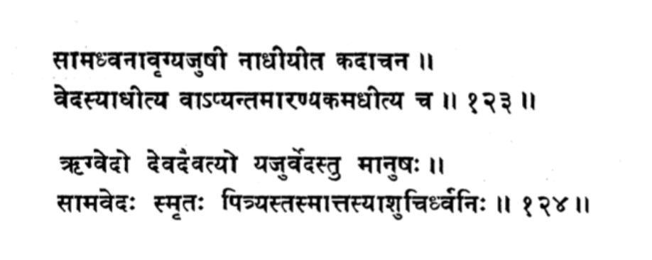 Hence all that the verse (no. 124) says is that when Sāmaveda is being recited, Ṛgveda and Yajurveda should not be practised by recitation. That is it.