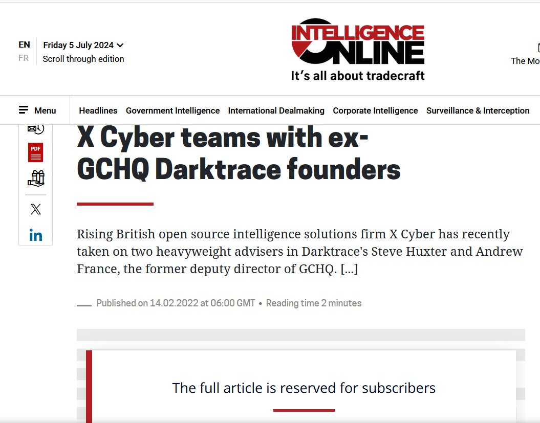 14.02.2022 : "Rising British open source intelligence solutions firm X Cyber has recently taken on two heavyweight advisers in Darktrace's Steve Huxter and Andrew France, the former deputy director of GCHQ."