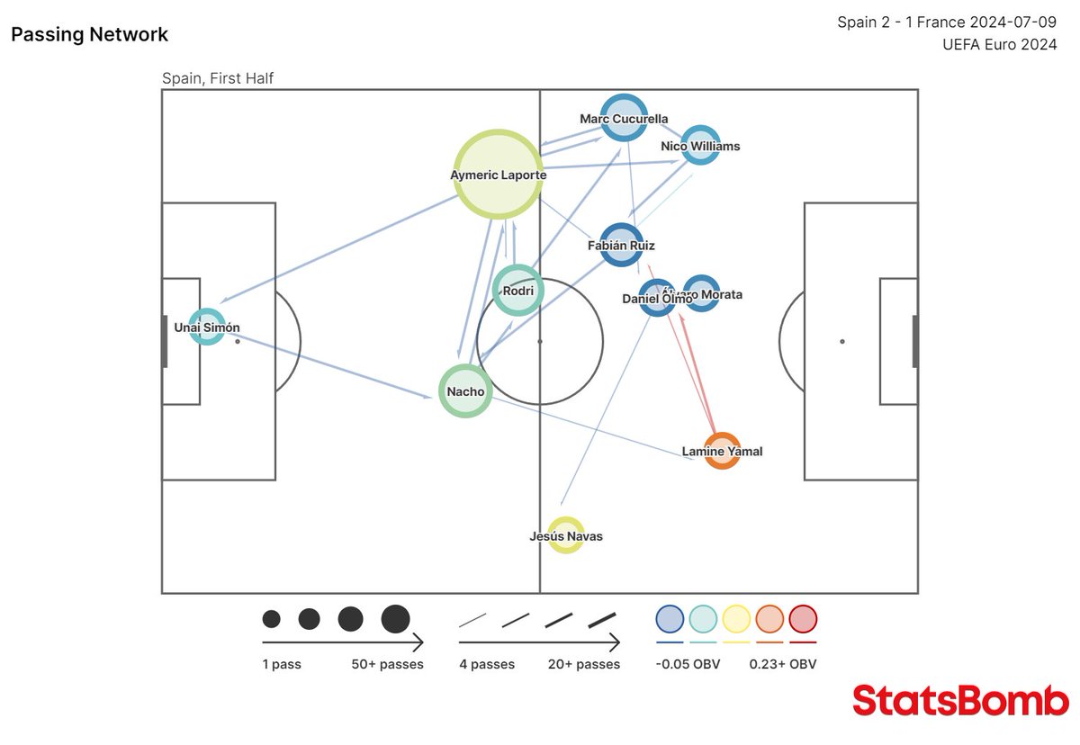 Rodri cerca de centrales, movilidad de Fabián y Olmo por dentro, Nico cerca de Cucurella pero no pegado a banda y Lamine totalmente por dentro.